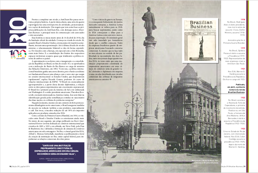 Criada em 1916, contratou a Porto de Ideias no ano de seu centenário para produzir uma série de reportagens sobre sua história para a Revista BRAZILIAN BUSINESS, editada pela câmara. O resgate foi precedido de uma pesquisa minuciosa do acervo da publicação, que se encontra tanto nos arquivos da instituição quanto na Biblioteca Nacional.